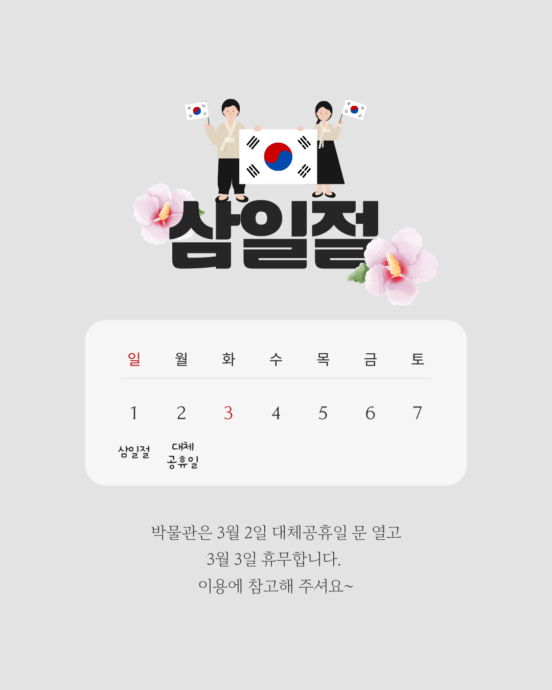 »ïÀÏÀý ¿¬ÈÞ¸¦ ¸Â¾Æ¼¼°èÀÎÇü¹Ú¹°°üÀº ´ëüÈÞÀÏÀÎ 3¿ù 2ÀÏ(¿ù¿äÀÏ) ¹®À» ¿°íÀÌÆ±³¯ÀÎ 3¿ù 3ÀÏ ÈÞ¹«ÇÕ´Ï´Ù.¹Ú¹°°ü À̿뿡 Âü°íÇØÁּſä~.°¨»çÇÕ´Ï´Ù!